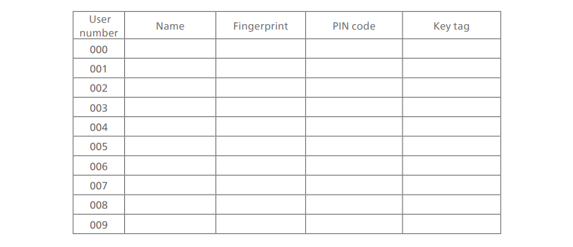 Philips DDL608-5HWS cung cấp tính năng quản lý User và người dùng cần phải thiết lập User code để thực hiện thao tác thêm/xóa thông tin đăng nhập. Bạn có thể lưu lại thông tin người dùng theo bảng dưới đây: