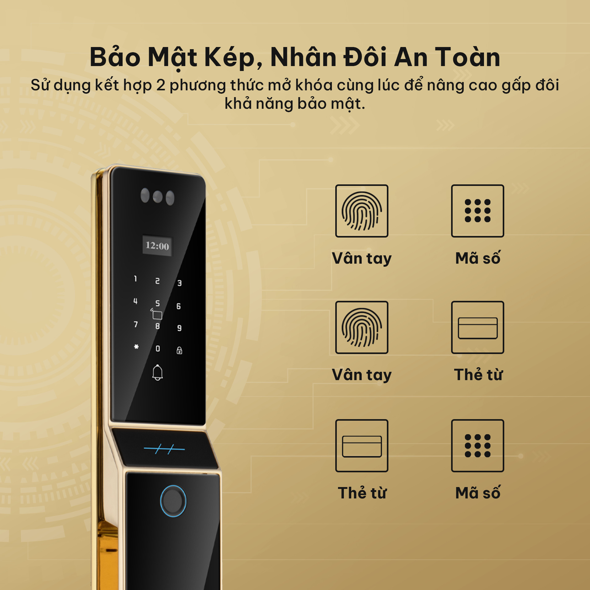 - Xác thực kép: Kết hợp hai phương thức mở khóa cùng lúc giúp tăng cường bảo vệ cho những không gian cần độ an ninh cao như phòng làm việc riêng, tủ tài liệu hoặc căn hộ cao cấp.