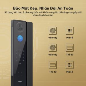 - Phương thức mở khóa bên ngoài: Gương mặt 3D, tĩnh mạch lòng bàn tay, vân tay, mã số, thẻ từ, chìa cơ, ứng dụng Hexa.