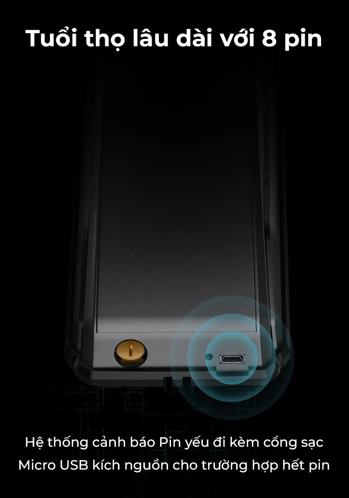 Kaadas K9-5W sử dụng 8 Pin Alkaline cho tuổi thọ sử dụng lâu dài. Thiết kế cổng sạc Micro USB ngay trên thân khóa dễ dàng sử dụng. Đây là cổng để cắm bộ kích nguồn cho trường hợp khẩn cấp, ví dụ như khi khóa hết pin.
