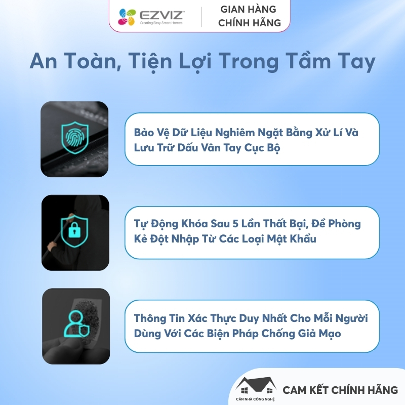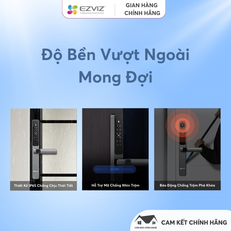 EZVIZ DL06 không chỉ dừng lại ở việc mở khóa nhanh chóng, mà còn mang đến lớp bảo vệ đa tầng. Công nghệ mã chống nhìn trộm giúp bạn nhập mật khẩu an toàn ngay cả khi có người đứng gần. Mọi thao tác mở khóa đều được ghi nhận và đồng bộ trên ứng dụng, cho phép bạn theo dõi lịch sử ra vào chi tiết. Kết hợp với khả năng cảnh báo tức thì khi có dấu hiệu cạy phá, DL06 đảm bảo an ninh ngôi nhà bạn luôn được đặt ở mức cao nhất, cho dù bạn đang ở nhà hay ở xa.